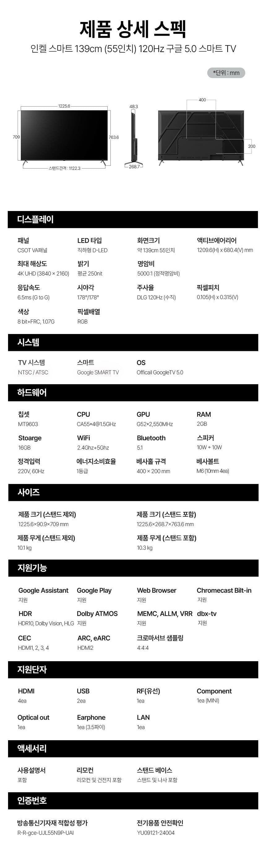[인켈] DLG120Hz 구글 5.0 스마트 TV 55인치