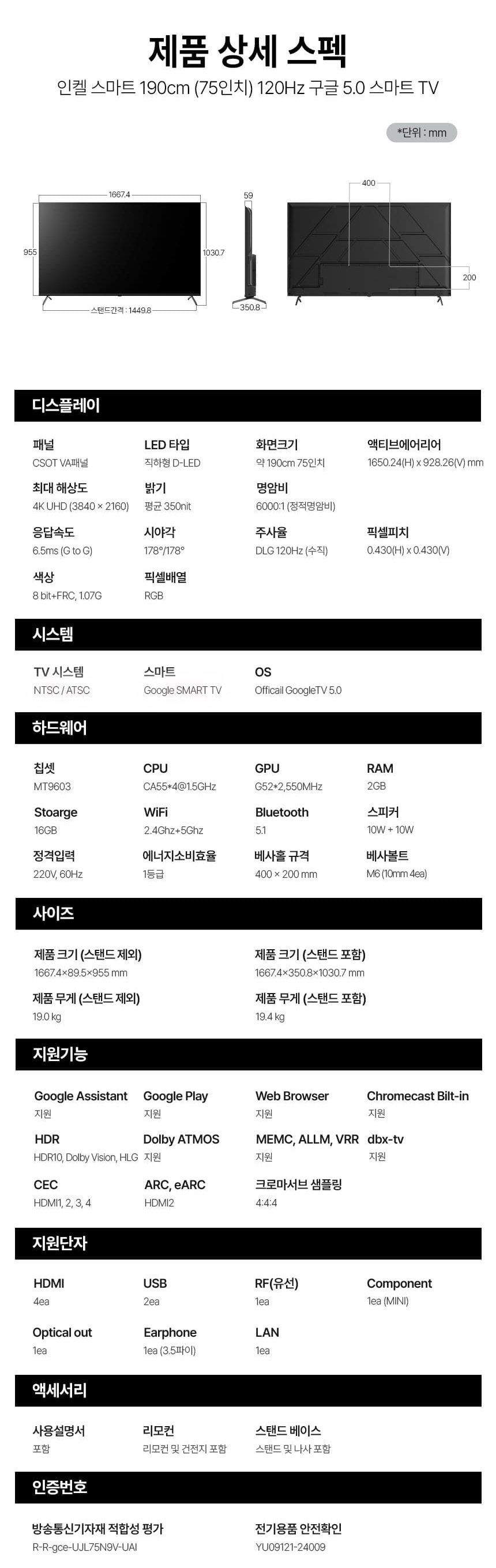 [인켈] DLG120Hz 구글 5.0 스마트 TV 75인치